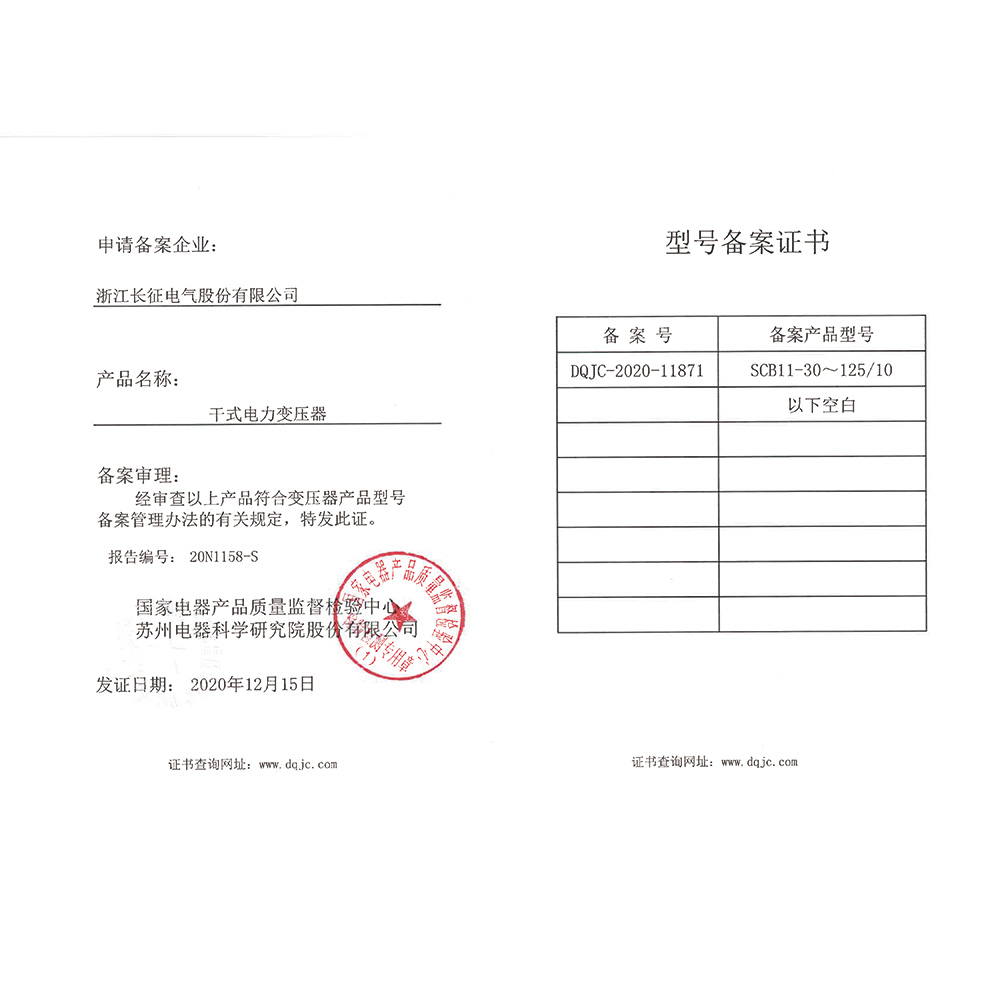 SCB11-30~125/10干式电力变压器 型号备案证书