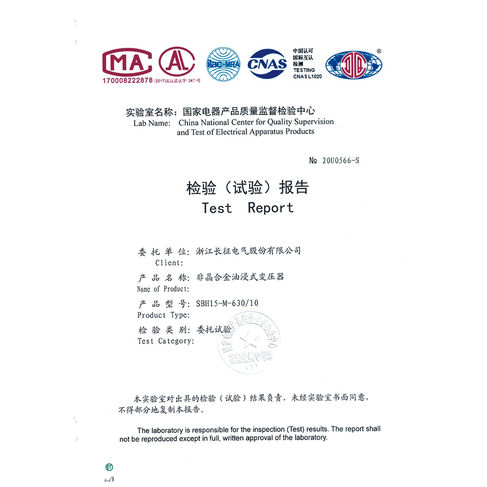SBH15-M-630/10非晶合金油浸式变压器 检验报告
