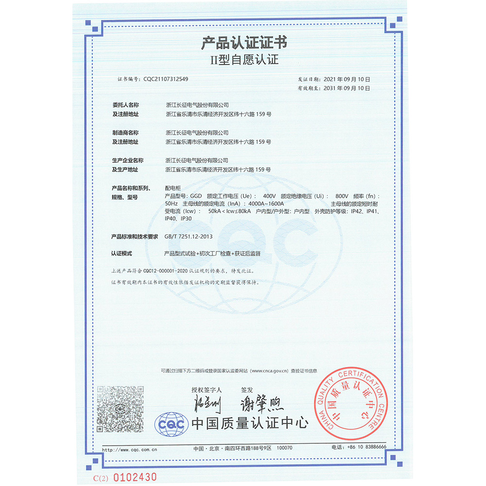 GGD配电柜 产品认证证书