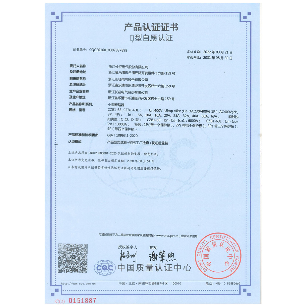 CZB1-63、CZB1-63L小型断路器 产品认证证书