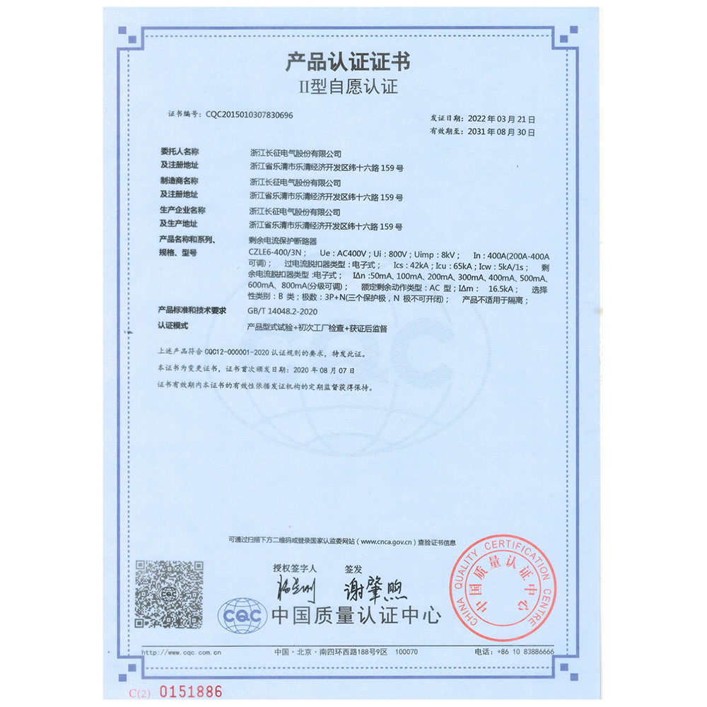 CZLE6-400/3N剩余电流保护断路器 产品认证证书