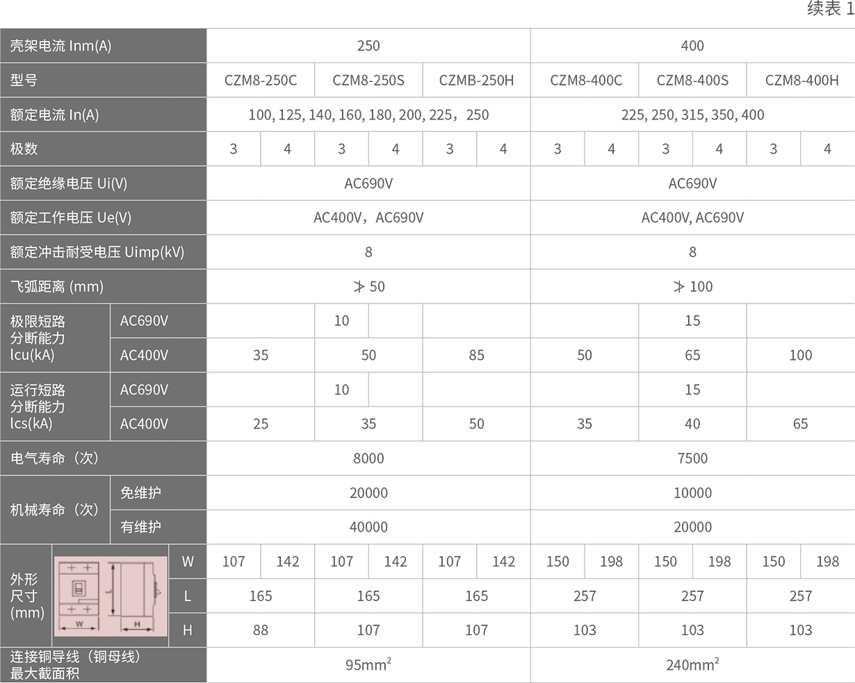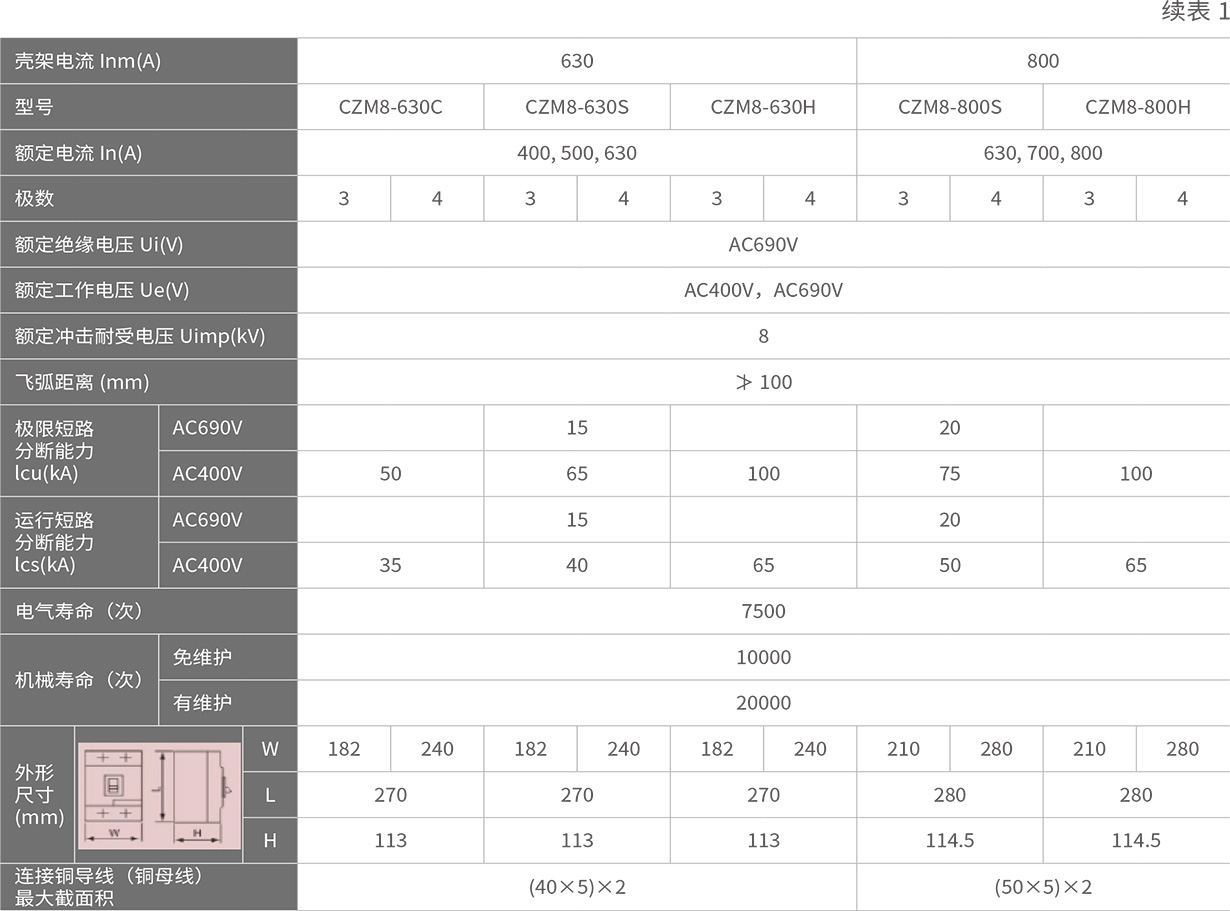 *CZM8-63/125 飞弧距离分“0”飞弧与 50mm 两种.应在订货时注明,四极断路器及 690V 规格无“0”飞弧。