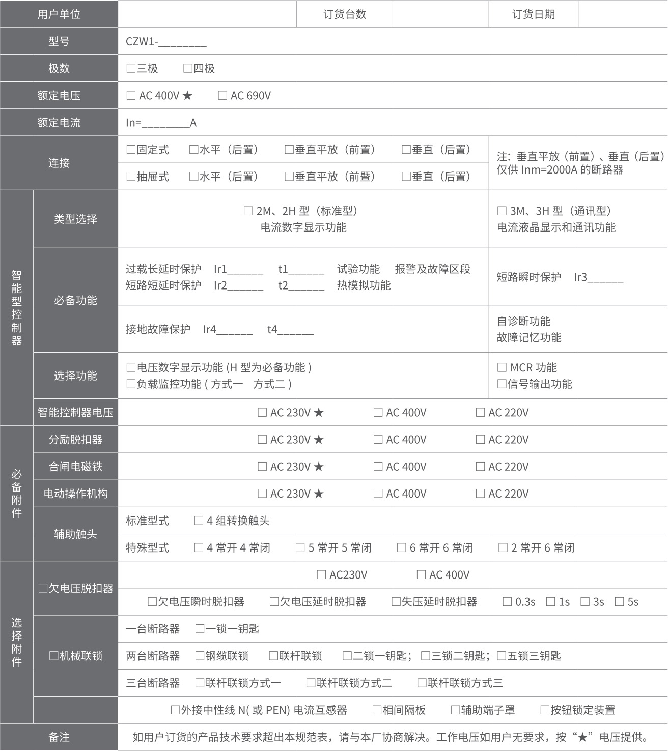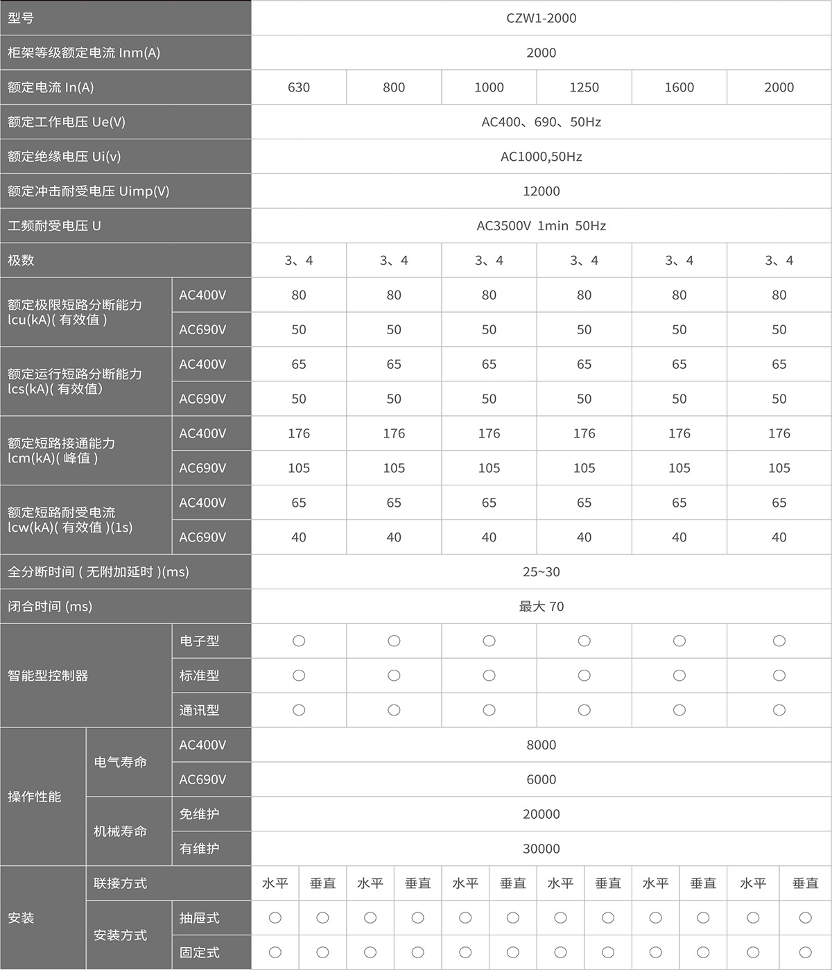 CZW1 系列智能型万能式断路器用于控制和保护低压配电网络。一般安装在低压配电柜中做主开关起总保护作用。其技术性能已达到了当代国际上同类型产品先进水平。 1、交流额定电流 630A-6300A; 2、短路分断能力 80kA-120kA( 有效值 ); 3、额定工作电压 AC690V 及以下; 4、具有 3 极和 4 极: 5、抽屉式和固定式; 6、可倒进线安装; 7、多种智能控制器,提供不同功能; 8、执行 IEC60947-2、GB/T14048.2 的标准。型号及其含义