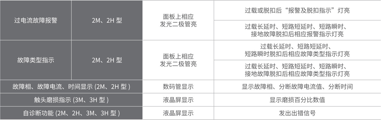断路器遇故障分断后,智能控制器能显示出故障类别、故障相序及故障电流值、分断动作时间值。