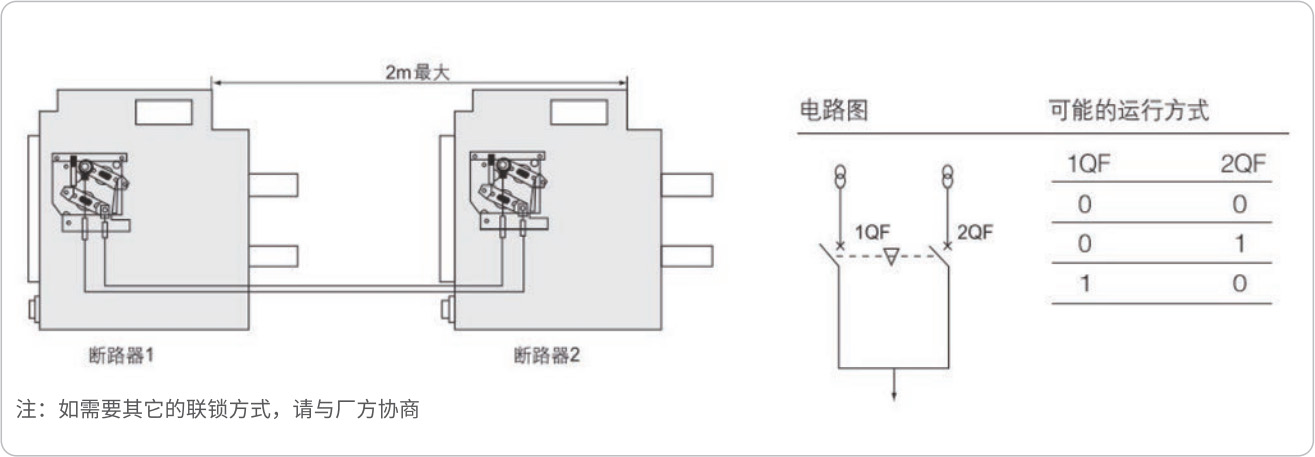 ◇ 两台平放抽屉式断路器的钢缆联锁或两台叠装抽屉式断路器的联杆联锁
