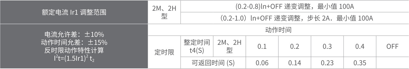 在低倍数电流时为反时限特性:当过载电流大于 8lr1 时自动转换为定时限特性。短延时 l2t 特性可“OFF”.此时呈定时限特性。